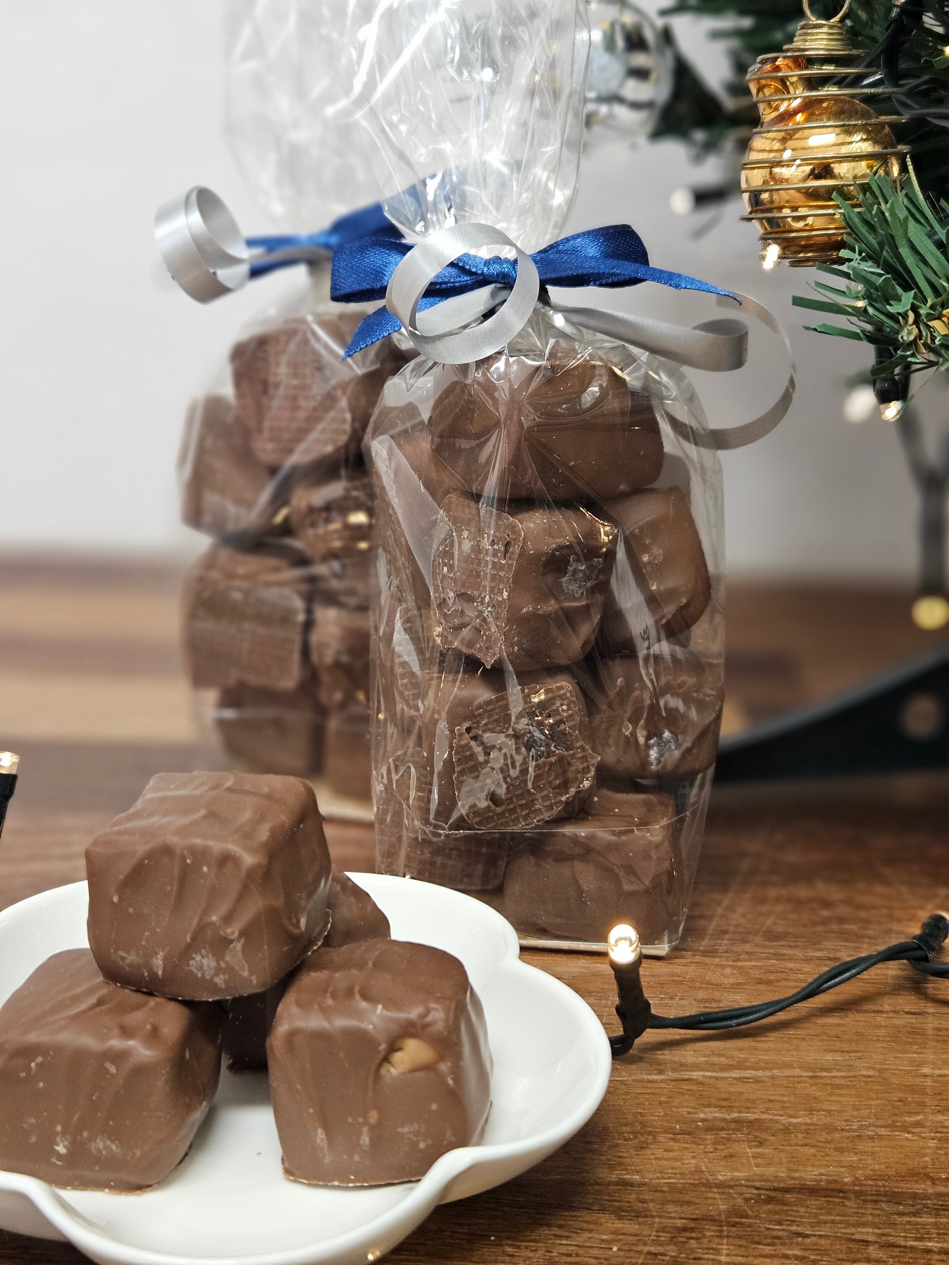 Indulge in the rich flavor of 10 chunks of chocolate covered Turkish delight, beautifully presented in a cellophane bag and tied with a festive ribbon. Perfect for gifting or as a stocking filler. Treat yourself or someone special to this decadent delight!